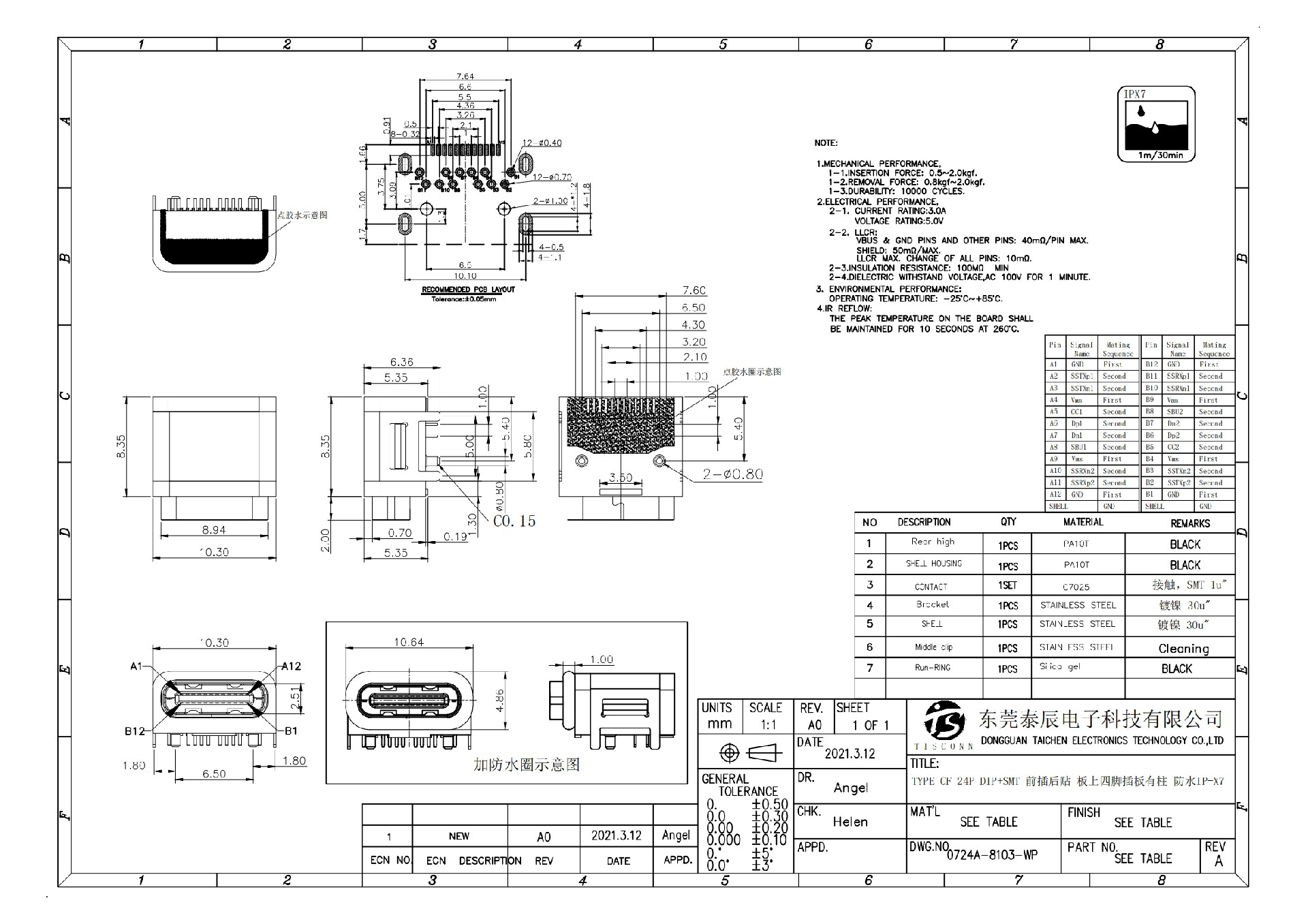 0724A-8103-WP TYPE CF 24P DIP+SMT 前插后贴 板上四脚插板有柱 防水IP-X7
