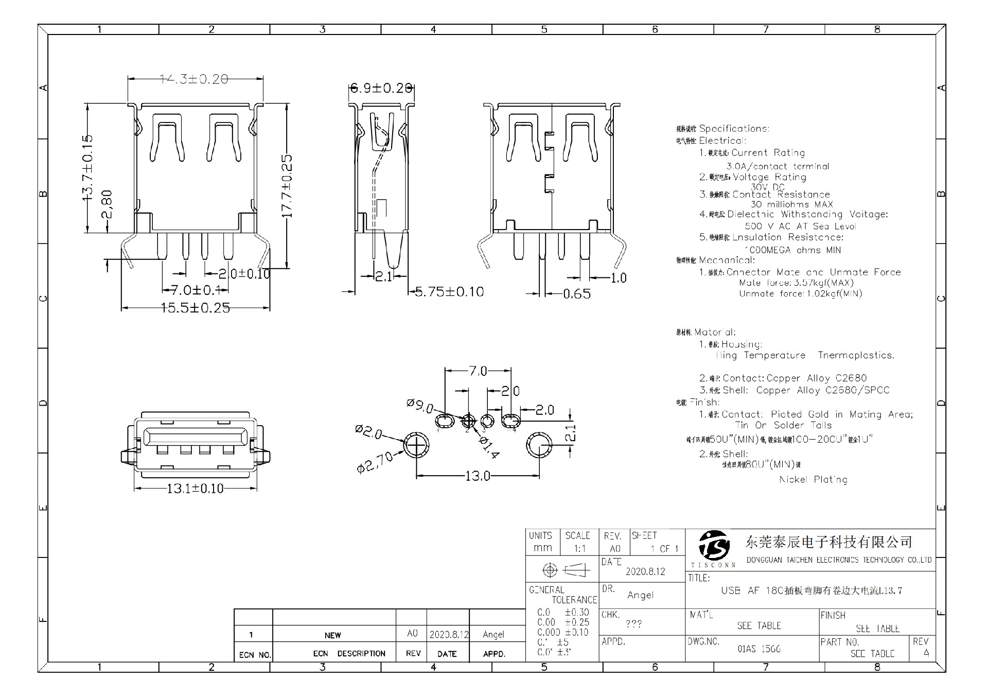 01AS-1566 USB AF 180度插板弯脚有卷边L13.7 大电流